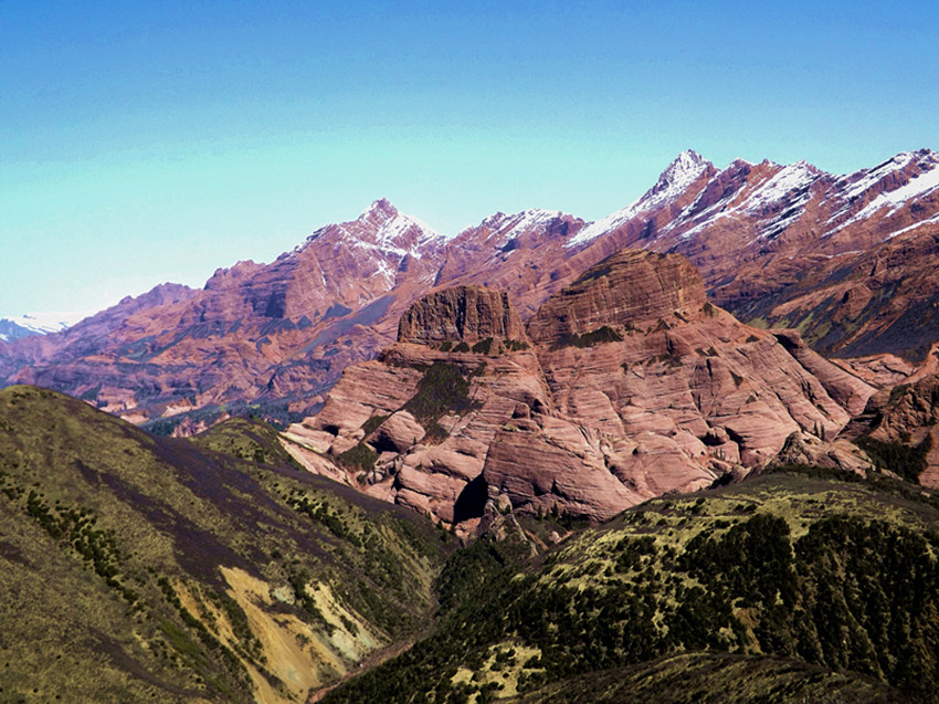 到了新龍縣,從新龍縣銀多鄉(xiāng)向北遠望,你就會看到迄今為止青藏高原上發(fā)現(xiàn)的海拔最高、區(qū)域最廣的丹霞地貌。綿延三十多公里的紅色,在烈日照耀下閃耀著刺目的光,與周圍墨綠色的山體形成鮮明的對比。
