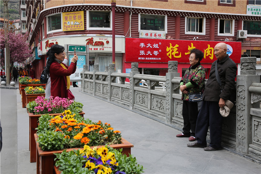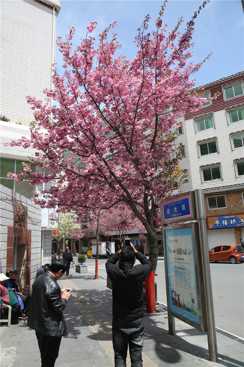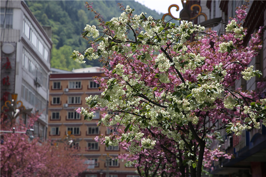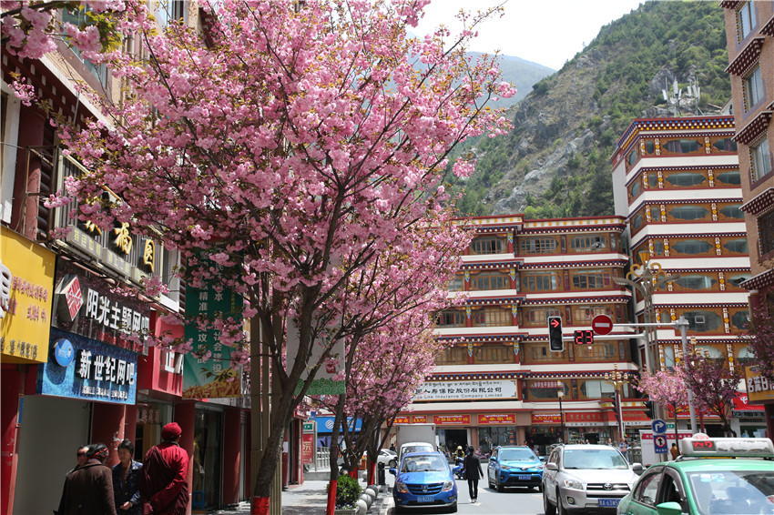 當(dāng)春天遇見最美的櫻花時(shí),驚艷了整個(gè)康定。櫻花與身邊人都將成為春日里的浪漫風(fēng)景。櫻花之美,美在氣勢,櫻花紛飛,夢幻唯美。每年4月中旬,康定城北門的櫻花綻放后,人們像是約好了一樣聚集到這里,共赴這一場甜美盛宴。這一路繁花似錦,人們穿過枝椏花正盛的櫻花林,穿過粉色海洋,徑直奔向一個(gè)浪漫的童話,一路櫻花飄散,一路粉光燦爛。櫻花絢麗繽紛、陸續(xù)綻放,若恰逢一陣春風(fēng)經(jīng)過,櫻花瓣隨風(fēng)舞動(dòng),猶如紛落的雪花,空氣中浮動(dòng)著櫻花特有的淡淡香氣,令人不禁懷疑自己置身夢境?!翱刀ǖ拇禾靵淼靡硪恍`放的櫻花,滿街的花草,折多河畔楊柳依依,康定的春天無比驚艷,醉了游人?!敝芟壬贿吪恼?,一邊感嘆,他在康定生活了40多年,20年前的康定,可以說找不到像樣的花草樹木,進(jìn)入新時(shí)代,康定城市變美了,城市綠化走在了前面,城市的美譽(yù)度舒適度不斷提升??刀ㄖ?,春色滿園,姹紫嫣紅,風(fēng)光旖旎。