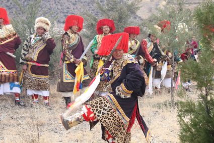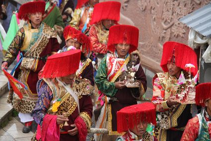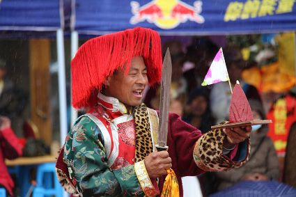 除了歌舞文化,德欽還是民俗文化最大的平臺(tái),神山祭祀是村村寨寨必不可少的活動(dòng),在德欽,藏民對(duì)山水自然賦予了靈性,認(rèn)為自然也是和人一樣有著生命和靈性,尊重自然演繹出神山祭祀活動(dòng)豐富多彩。“刀贊” 藏語(yǔ)稱“百諧”。在德欽農(nóng)村,刀贊是祭祀活動(dòng)的重頭戲,這一天,不亞于一個(gè)盛大的服飾表演。相傳“百諧”是古時(shí)村民為消除戰(zhàn)亂,祈福平安的一項(xiàng)傳統(tǒng)祭祀活動(dòng),延續(xù)至今已經(jīng)成為一項(xiàng)傳統(tǒng)的民俗活動(dòng)。“百諧”既是祭祀活動(dòng)的一個(gè)儀式,也是一個(gè)獨(dú)立的傳統(tǒng)民俗活動(dòng),村里每戶一男丁在這一天必須參加“百諧”。“蘇夏”是村里男人戴的最為隆重的帽子,他不同于金邊帽和狐皮帽。長(zhǎng)刀是“刀贊”的道具, “吉祥的日子里,我們一敬天地,賜給我們帶來(lái)幸福的生活;再敬尊敬的共產(chǎn)黨,為我們帶來(lái)平安吉祥;三敬慈祥的雙親,教會(huì)我們?nèi)绾巫鲆粋€(gè)好人……”朗朗上口的說(shuō)詞伴著閃閃的刀光起舞,頗具康巴壯士的英武陽(yáng)剛。