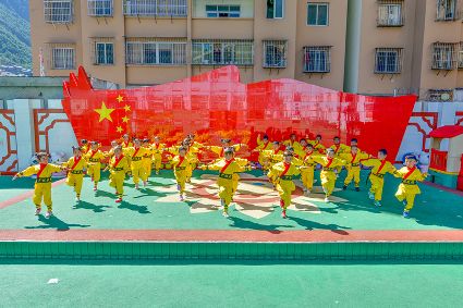活動形式多樣,有稚嫩的獨唱,有歡快的舞蹈,有英姿颯爽的少林功夫......活動最后,由園長引領(lǐng)全體師生合唱的《我和我的祖國》,每個孩子手中揮動的一面小紅旗匯成了紅色的海洋,我用相機捕捉他們的表情時,看見幾位老師的眼睛閃爍著晶瑩......