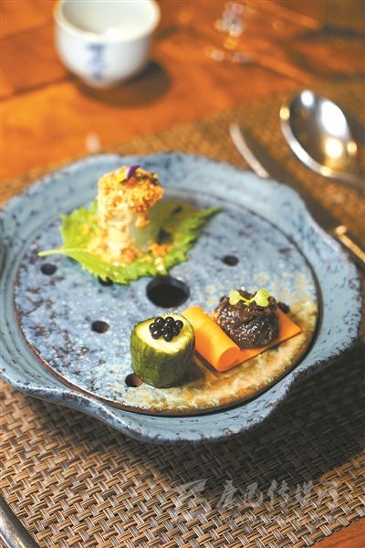 在不少素食店里,廚師會(huì)充分利用當(dāng)季食材,不時(shí)不食的廣府飲食理念也更為凸顯。慈姑、金桔都是春季的食材,因此被天水蔬食料理運(yùn)用到“雨水”節(jié)氣的菜單里。據(jù)店長介紹,慈姑是生長于水中植物,如同土豆一般軟糯。廚師用南乳和腰果做成堅(jiān)果醬,作為慈姑的配搭醬料。慈姑被切成片,中間夾著梅菜,再用堅(jiān)果醬“粘合”起來,還原慈姑原本的形狀,再通過烤箱烤制,再配搭撒上意大利黑醋的臺山花菜,口感豐富。金桔用來做甜品,將金桔挖空,里頭放入一個(gè)核桃,表面再鋪上一層風(fēng)干的金桔果干,做成一件小巧甜品“金桔核桃糖”,其設(shè)計(jì)靈感源自廣東金桔糖。與它一同出場的還有用金桔果肉打醬做成的金桔年糕,也十分甜美。