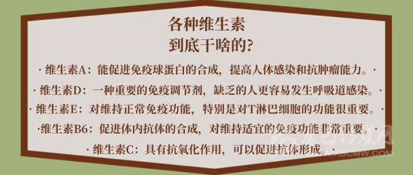 維生素A能促進(jìn)免疫球蛋白的合成,提高人體感染和抗腫瘤能力;維生素A還能消除免疫耐受。影響免疫反應(yīng)的各種細(xì)胞因子也可能在維生素A缺乏時(shí)發(fā)生改變,從而影響體內(nèi)抗原-抗體反應(yīng)。