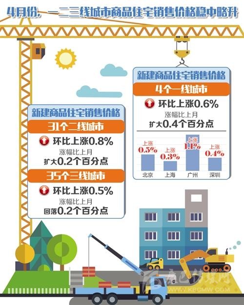 國家統(tǒng)計(jì)局城市司高級(jí)統(tǒng)計(jì)師劉建偉表示,4月份一線城市新建商品住宅和二手住宅銷售價(jià)格環(huán)比漲幅均略有擴(kuò)大;二線城市新建商品住宅銷售價(jià)格漲幅擴(kuò)大,二手住宅漲幅回落;三線城市新建商品住宅銷售價(jià)格漲幅回落,二手住宅漲幅微升。