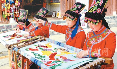 3月27日,繡娘正在陜西省漢中市寧強縣青木川羌繡傳習基地生產(chǎn)羌繡繡品。