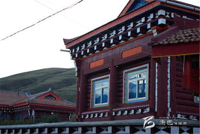 道孚民居的一般結(jié)構(gòu)是以藏式木架穿逗,作為整體骨架,一般為二、三層;以片石或泥土砌墻,按正方形各邊7-10尺為空間立柱,四柱之間稱一空,一般房屋有16-30空,也有40、50空的。柱與柱之間有穿枋或原木鎖拉扯,其余維護(hù)結(jié)構(gòu)由橫向平置,圓弧朝外的對(duì)剖圓木組成,它們層層重疊、四角交叉相搭,房頂高約5至8米。比起改進(jìn)前,柱子直徑普遍加大,豪宅的柱子需兩人合圍,給人一種穩(wěn)重之感;底層和二層的木柱連體,并仿照內(nèi)地建筑的木穿逗式結(jié)構(gòu),梁柱接榫,形成一個(gè)牢固的整體,以增強(qiáng)抗震能力。外形多為四方形,二樓呈L形、凹形或回形,內(nèi)層結(jié)構(gòu)是純木材,架“棒柯”或“棒勒”,間隔為各種用途的房間。房間上裝木望板,下鋪木地板,頂蓋用樺樹皮或硬雜木條墊底再鋪“阿嘎土”,日曬雨淋絕不漏水。屋架門窗外表的裸露部分,則多以油漆或自制的有色土染過(guò),既防腐防蛀,又美觀大方。從外部看,二層平臺(tái)的女兒墻上,種滿了各種花草,房前屋后還種植了果樹。用泥土夯筑的底層和二層后方的土墻刷成白色,而木質(zhì)的半圓木墻體涂成褐紅色,窗框和窗扇均作彩繪,室內(nèi)裝飾也都用紅色等“火熱”的基調(diào)。各種色彩相互協(xié)調(diào)映襯,給人的印象特別深刻。