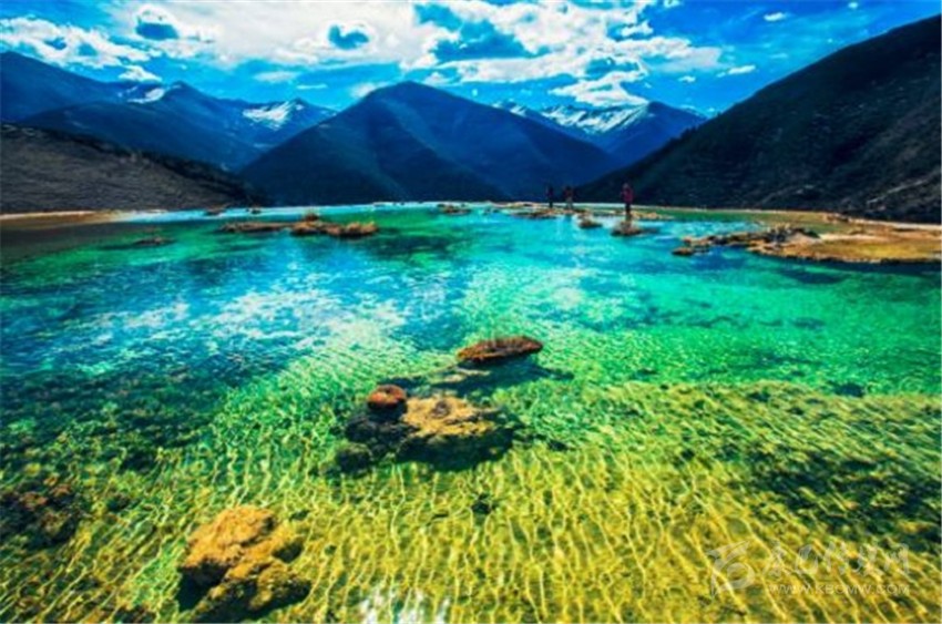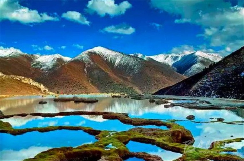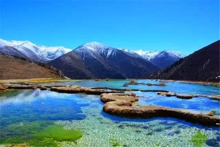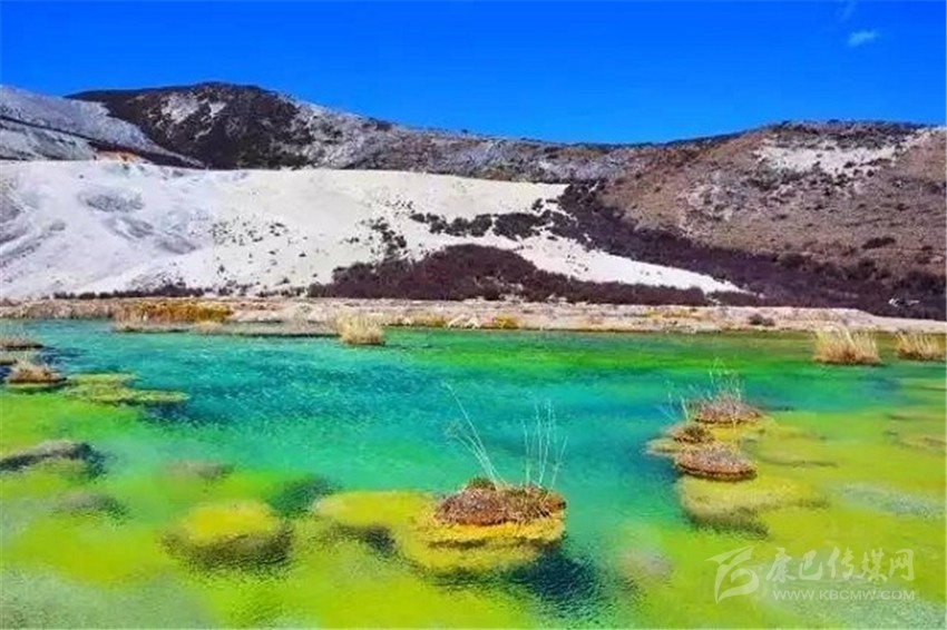 泉華灘海拔約4000米,屬于高山河谷草甸地貌。東南面就是貢嘎山,這里是觀看“蜀山之王”的絕佳位置。它因一種含有大量化學(xué)物質(zhì)的泉水在地表產(chǎn)生化學(xué)沉淀而成,從另一個山頭傾斜下來大片的白色鈣化土,延伸到谷底后便變化出四層五彩的鈣化池。每個階地上有十幾個大小不同、形態(tài)各異的五色彩池,水深40-70厘米,彩池里水草相依,石花點(diǎn)點(diǎn),疑為瑤池降臨人間!