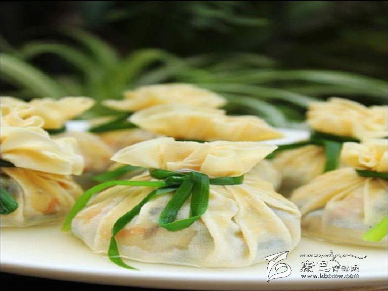 8、韭菜在熱水中燙一下,過(guò)涼開水,系在燉好的八寶錢袋上做下裝飾即可