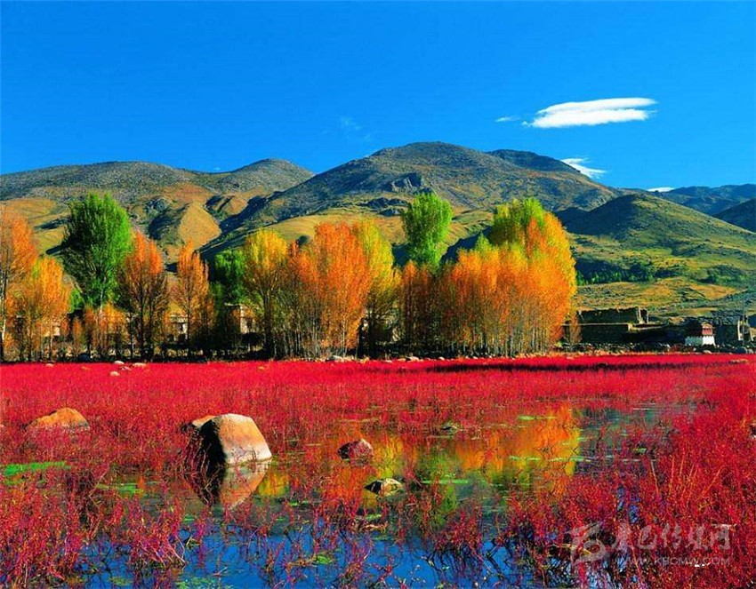 10月的紅草灘一片通紅,好像水面上在燃燒一樣,沒有草的水面將藍天白云倒映其中,背景又是一排排金黃色的楊樹林,結(jié)合在一起就構(gòu)成了這里如夢般五彩斑斕的世界。