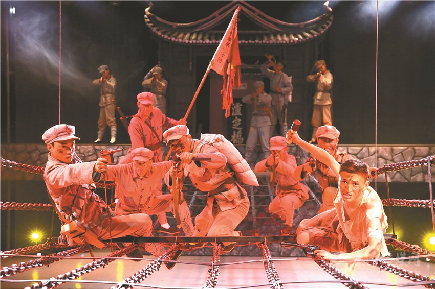 本網(wǎng)訊 在身著紅軍服、打著“火把”的戰(zhàn)士的引領(lǐng)下,觀眾緩緩而行,在經(jīng)歷一場激烈的戰(zhàn)斗后,大家走過銷煙彌漫的戰(zhàn)場,來到實(shí)景劇場,以一位“親歷者”的身份“穿越”至歷史的場景。幽深的河谷、洶涌的波濤、兇殘的敵人、英勇的戰(zhàn)士、激烈的戰(zhàn)斗……隨著劇情的展開,讓人親臨其境84年前那場驚天動(dòng)地的重要戰(zhàn)役——《飛奪瀘定橋》。