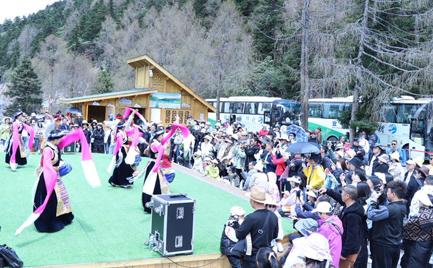 春雪消融,大地復蘇,高原上肅穆的景色正變得郁郁蔥蔥、多姿多彩起來。5月1日,康定情歌(木格措)風景區(qū)天氣晴好,高山杜鵑在山澗中次第開放,景區(qū)內(nèi)人流如織,游客有的是一家老小有說有笑,有的是三五好友打卡拍照。行走在高山湖泊造就的自然環(huán)境中,耳畔是鳥兒和河水流動的和聲,信步林間,牧歌牛群,木格措清凜可人。在木格措觀景臺,還上演了14場藏族非遺歌舞,歡快的舞蹈和秀麗的風光讓游客沉醉其中、留戀忘返。