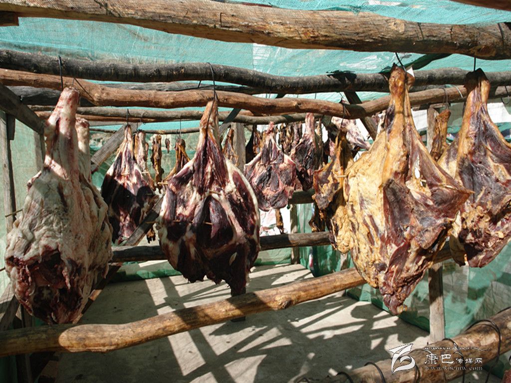 丹巴嘉絨藏族年期間,在酸菜包子、火燒饃、香豬腿等眾多的風(fēng)味飲食中,“藏香豬腿”是必不可缺的美食佳肴,也是給長輩拜年和親朋好友間互送的最佳禮品。“藏香豬腿”的制作方式也象丹巴嘉絨藏族年一樣的獨(dú)特。丹巴人宰殺年豬的方式通常有用繩索死吊或者用刀從勁入殺心臟致死兩種,現(xiàn)在采用后一種方式宰殺豬居多。當(dāng)?shù)厝藢⒇i宰殺后用熱水燙,處理好豬毛,再在胸口用刀開一孔,將手伸人胸腔扯斷心肺連接處,然后將其剖開,并把肥、瘦豬肉分離開,剝?nèi)グ逵?,處理好其他?nèi)臟,將豬腿按原形分離,爾后經(jīng)霜凍、柏枝熏、自然風(fēng)干后存放在儲(chǔ)藏室內(nèi)。豬腿存放一冬后,色、香、味俱佳。食用時(shí)煮成半熟或用炭火將表皮烘烤,切成小塊狀或撕成粉絲狀,在百米內(nèi)即可聞到香味,入口鮮嫩清香,營養(yǎng)豐富,誘人食欲。