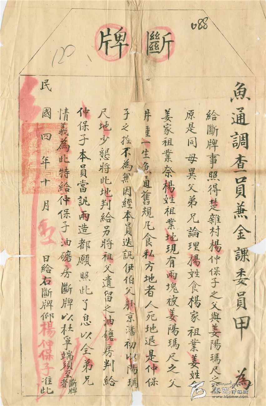 這張“斷牌”說的事情發(fā)生在“民國4年”(公元1915年),用今天的眼光來看應(yīng)算是一件“民事糾紛”。在一處地名“楚雜村”的地方,一個叫“楊仲保子”的人和一個叫“姜陽瑪尺”的人因?yàn)楦厮袡?quán)的事發(fā)生了糾紛。這兩個人其實(shí)是同母異父的兄弟。為了平息兩個人之間糾紛,也是為了保全兄弟情誼,又從公平角度出發(fā),甲調(diào)查員就把一處“油磨房”斷給“楊”姓所有。事情就這么斷了,為了防止以后再為這事發(fā)生糾葛,甲安仁調(diào)查員就發(fā)出了這樣一張可以作為“憑證”,其實(shí)是在當(dāng)年的那種情形下具有法律效力的“證書”。