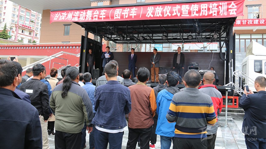 本網(wǎng)訊(記者 宋志勇 文/圖)6月22日,我州流動舞臺車(圖書車)發(fā)放儀式暨使用培訓(xùn)會在康定舉行,旨在為全州13個縣(市)及州歌舞團、州圖書館統(tǒng)一配發(fā)流動舞臺車、圖書車,著力解決基層群眾看文藝演出難、看圖書難以及文藝表演團體下鄉(xiāng)演出搭臺難、轉(zhuǎn)點難等實際困難,進一步豐富基層農(nóng)牧民群眾文化生活。這是繼全國文化信息資源共享、鄉(xiāng)鎮(zhèn)綜合文化站建設(shè)實施的又一文化惠民工程。