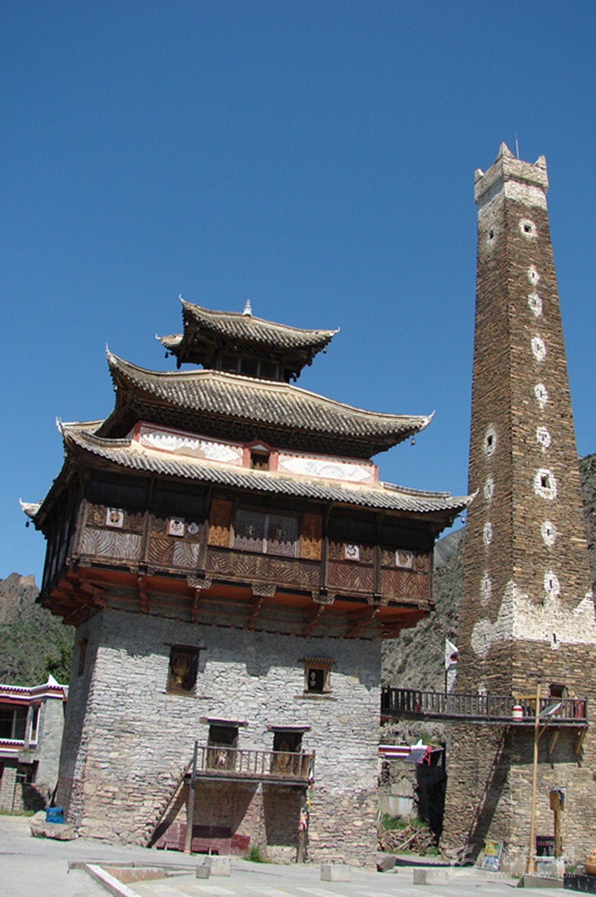 過小金縣城,車行四十余里,轉(zhuǎn)過幾道山坳,遠(yuǎn)處,在藏寨的護(hù)衛(wèi)下,一座古碉拔地而起。朝陽的柔光輕輕地灑在古碉上,在藍(lán)色天幕的襯托下,顯得更加的偉岸雄奇了。沃日土司官寨,清乾隆十五年(1750)由沃日安撫司所建。“沃日”,藏語領(lǐng)地之意。走過一道橫跨沃日河的拱橋,便來到了土司官寨碉樓下的廣場(chǎng)。廣場(chǎng)占地約有二百余平米,前面有巍峨的護(hù)衛(wèi)碉和經(jīng)堂碉,后面和左面是鱗次櫛比的藏族民居。這里的藏族民居一般為四層,房屋外墻全用石頭泥土砌筑而成,所有的窗戶邊,用白色的石灰水勾勒?qǐng)D案,外墻的底部及墻角處用石灰水勾勒出形如高山峻嶺的尖角。民居的大門前都砌有花臺(tái),里面花朵正競(jìng)相開放。