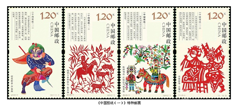 2018年1月24日,中國(guó)郵政發(fā)行《中國(guó)剪紙(第一組)》特種郵票,全套4枚。這是中國(guó)郵政繼1959年1月1日發(fā)行的《剪紙》特種郵票59年后重新發(fā)行的《中國(guó)剪紙》系列郵票。全系列郵票計(jì)劃發(fā)行4組,每組4枚。這次發(fā)行的第一組4枚郵票入選內(nèi)容分別是被列入第一批國(guó)家級(jí)非物質(zhì)文化遺產(chǎn)名錄的北方四處剪紙傳承人的作品:第一枚“河北蔚縣·蘆花蕩”,河北蔚縣剪紙歷史悠久,風(fēng)格獨(dú)特,題材多取自于人物,造型設(shè)計(jì)疏密有致,點(diǎn)染絢麗鮮艷。此幅作品作者王老賞(1890-1951),河北省蔚縣南張莊村人;第二枚“內(nèi)蒙和林格爾·牧羊圖”,內(nèi)蒙古和林格爾剪紙多反映游牧生活,具有古拙浪漫、質(zhì)樸奔放、熱情率真的藝術(shù)風(fēng)格。此幅作品作者張花女 (1903-2004),和林格爾縣董家營(yíng)鄉(xiāng)曹老八夭村人;第三枚“陜西旬邑·江娃拉馬梅香騎”,陜西旬邑的彩色剪紙具有民間美術(shù)的鮮活靈動(dòng),無(wú)拘無(wú)束,形象稚拙而又鮮明,構(gòu)圖緊密完滿而又單純明快,色彩對(duì)比強(qiáng)烈而又協(xié)調(diào)適度。此幅作品作者庫(kù)淑蘭(1920-2004),陜西咸陽(yáng)市旬邑縣張洪鎮(zhèn)赤道鄉(xiāng)富村人;第四枚“山西新絳·小別母”,山西新絳剪紙藝術(shù)源遠(yuǎn)流長(zhǎng),內(nèi)容豐富多彩,尤以人物見長(zhǎng),戲曲題材作品更為突出,構(gòu)圖簡(jiǎn)潔飽滿、精煉極致,粗獷中見典雅,簡(jiǎn)煉而不簡(jiǎn)單。此幅作品作者蘇蘭花(1906-1995),山西運(yùn)城市新絳縣澤掌鎮(zhèn)北蘇村人。