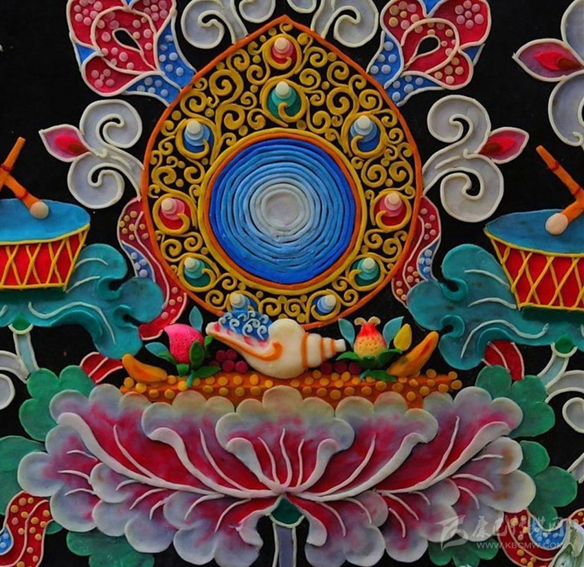 有傳說稱641年文成公主進(jìn)藏,帶去一尊釋迦牟尼12歲等身像并將其供奉于拉薩的大昭寺,當(dāng)?shù)厝罕娪盟钟妥龀苫ü┇I(xiàn)于佛前,以示崇敬之心,后各藏傳佛教寺院相繼使用,視為禮佛珍品,獻(xiàn)酥油花遂成為正月祈愿大法會的重要內(nèi)容。在發(fā)展過程中,酥油花的塑造方式、花色品種、內(nèi)容題材和工藝技巧都不斷發(fā)生著變化。