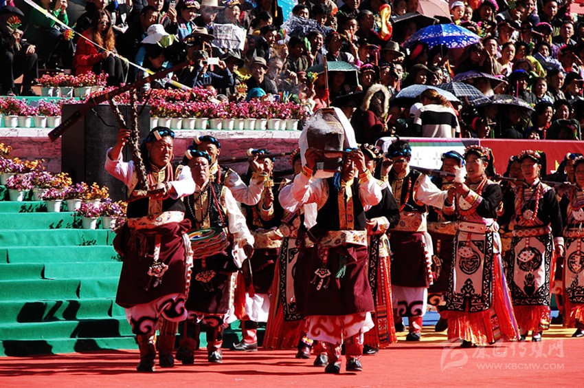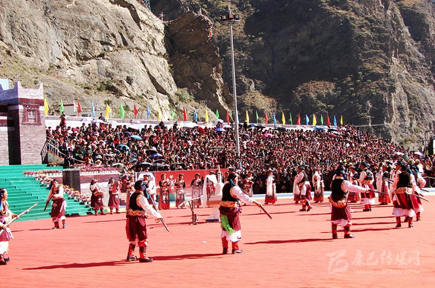 槍舞,嘉絨語中稱為“訥沖呷兒”,主要是在祭祀、集會、節(jié)日時表演的一種近似于戰(zhàn)術(shù)的舞蹈。在舞蹈中,舞者圍成一個圓圈,手持明火槍,明火槍,是最早的一種真正適于在戰(zhàn)場上為軍事目的使用的火槍。槍膛為一根圓柱形的鐵筒,筒口直徑為三厘米左右,在槍膛底部,有一個小圓孔伸出槍管,為導(dǎo)火管。如耳朵狀,因此也稱為槍耳,主要是用來點火的地方。圓筒固定在堅硬的木托頂端。這種輕火器或者說小型火炮使用的是形狀不規(guī)則的彈丸,即不大的實心彈,它緊貼大?;鹚幹瞥傻难b藥,借緊挨導(dǎo)火孔的火繩發(fā)射。