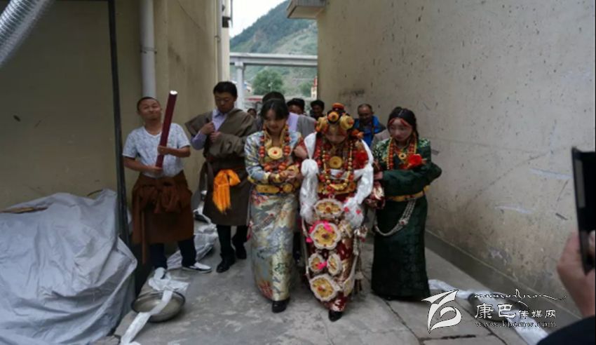接親。除表現(xiàn)主人的熱情、好客、大方外,還要講究氣派,顯富有、高檔次、高規(guī)格。以娶親為例,舉行婚禮的當(dāng)天,男方要組織數(shù)十匹馬隊(duì)或高檔汽車接親,披金掛銀,蔟新華麗。接親的馬隊(duì)從新娘家出發(fā)后,男方要在家或路過人家必經(jīng)之地設(shè)置吉祥物,如盛滿一桶水或鋪一床藏毯、或隨身衣物鋪在地上,當(dāng)接送新娘的馬隊(duì)路過時,接親的人要給吉祥物獻(xiàn)哈達(dá)和拋撒銀錢、紙錢和糖果等以示新娘路遇彩頭、沖喜,表示吉祥如意。到男方家后新娘被扶下馬或扶下車,高僧大德頌吉祥詞后,圍繞所放佛像或吉祥八寶圖及裝滿水或牛奶的銅鍋順轉(zhuǎn)三圈后,踩著從大門口鋪至經(jīng)堂的藏毯進(jìn)屋,進(jìn)入客廳之前新娘只身先進(jìn)廚房,點(diǎn)燃灶里準(zhǔn)備好的柏香紅木或枝葉進(jìn)行熏煙,據(jù)藏醫(yī)考證熏香煙對身心健康有益,也可表示從即日起新娘便是男家的主婦了。