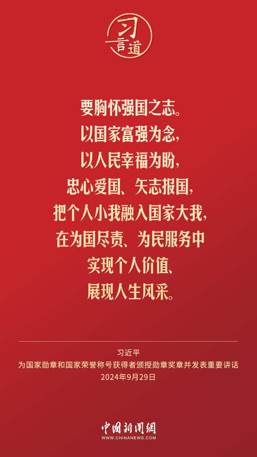 經(jīng)中共中央批準(zhǔn),中華人民共和國國家勛章和國家榮譽稱號頒授儀式于9月29日上午10時在人民大會堂隆重舉行。中共中央總書記、國家主席、中央軍委主席習(xí)近平向國家勛章和國家榮譽稱號獲得者分別授予“共和國勛章”“友誼勛章”和國家榮譽稱號獎?wù)虏l(fā)表重要講話。習(xí)近平指出——