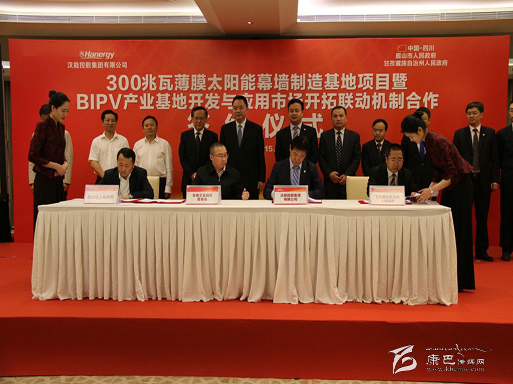 簽約儀式由州委副書記、州政府州長益西達瓦主持。眉山市委副書記、市長宋朝華和漢能控股集團執(zhí)行總裁、漢能光伏產業(yè)集團董事長馮電波出席簽約儀式并致辭。州委常委、州政府常務副州長陳忠義代表州政府簽約。眉山市委常委宣迅,市委常委、甘眉工業(yè)園區(qū)黨工委第一書記王光彩,市政府副市長唐宏以及漢能控股集團相關負責人、兩市州相關部門和甘眉工業(yè)園區(qū)負責人參加簽約儀式。