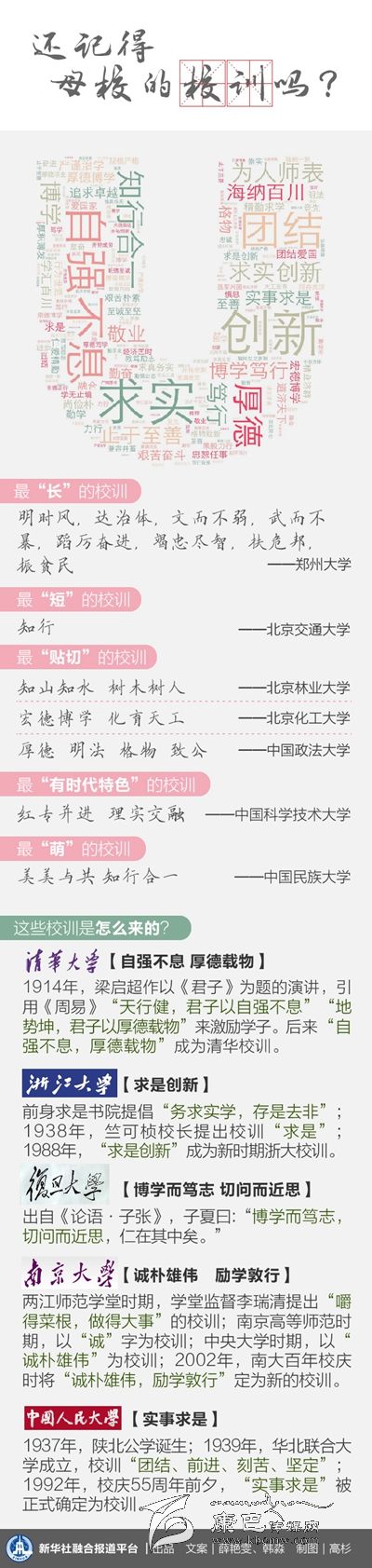 一份對100多所中國高等學府校訓的統(tǒng)計顯示,出現(xiàn)頻次最高的詞是“求實”,其次是“創(chuàng)新”、“博學”、“厚德”,一個‘實’字始終貫穿于不同時代、不同環(huán)境的校訓之中。