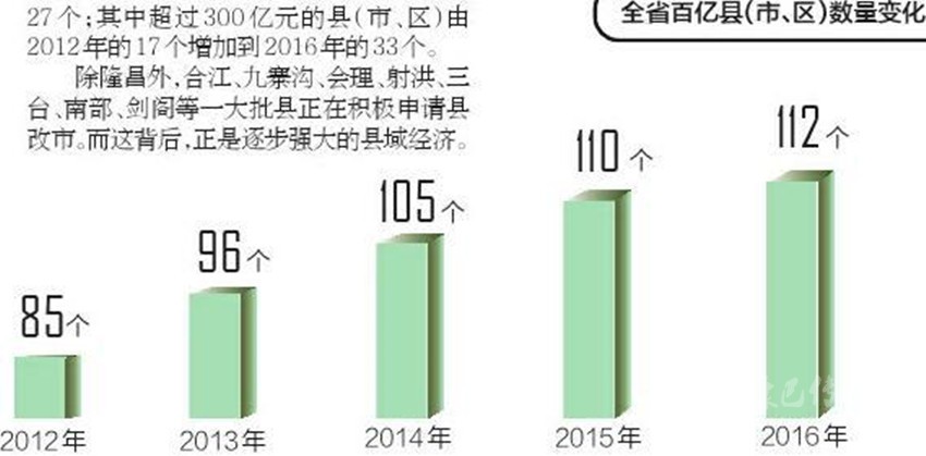 放眼全省,2016年,GDP突破百億元大關的縣(市、區(qū))112個,比2012年增加27個;其中超過300億元的縣(市、區(qū))由2012年的17個增加到2016年的33個。