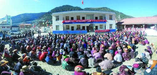 離水洼鄉(xiāng)政府三十余里的那拉崗村中澤一家三口為了避開“桑然路”限行時(shí)間,大清早就從村里出發(fā)到鄉(xiāng)政府等候宣講團(tuán)的到來。“十八大召開后,我們村里路通了,家里有電了,小孩上學(xué)也不要錢了,我很想知道十九大會有什么好政策?!敝袧杉拥卣f。因?yàn)橹乐菸罕娦v團(tuán)上午要到寺廟宣講,桑披寺的僧侶傾真比平時(shí)早起兩小時(shí)做早課。而在尼斯鎮(zhèn)的宣講現(xiàn)場,宣講團(tuán)的汽車被前來聽宣講群眾的摩托車和小車堵得水泄不通。