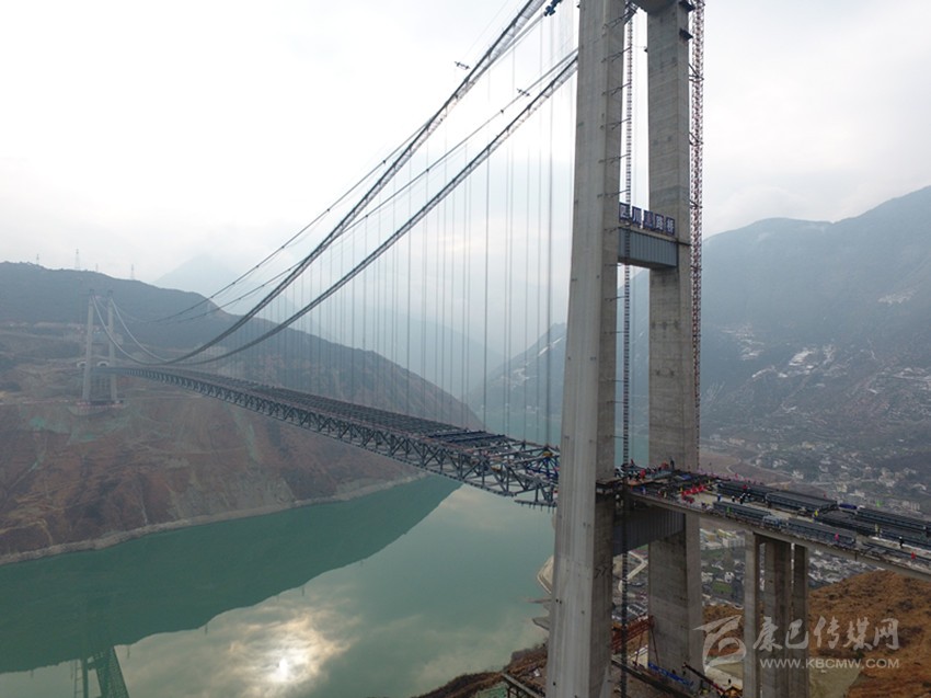 “大橋鋼桁梁完成合龍,標志著大橋全面進入橋面施工階段,也標志著這座建設在高海拔、高地震烈度帶、復雜風場環(huán)境下的超大跨徑鋼桁梁懸索橋,施工中最難、風險最大的施工全面完工?!毖趴蹈咚夙椖坎扛苯?jīng)理柏國勝激動地說。
