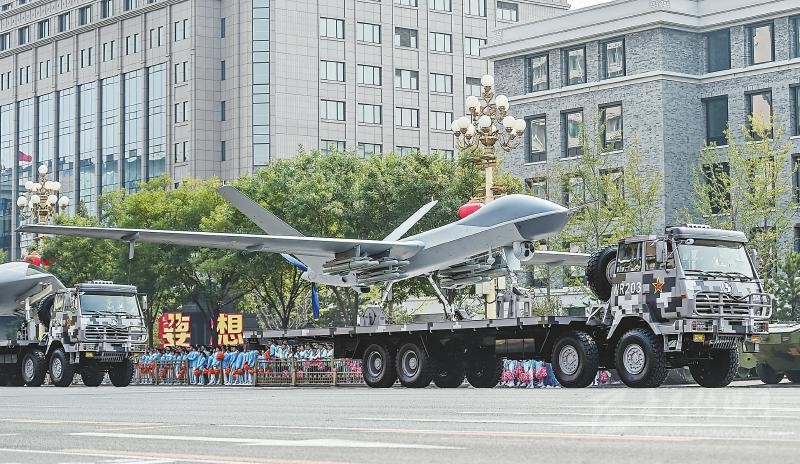 在兩輛指揮引導(dǎo)車帶領(lǐng)下,由攻擊-2無人機(jī)、攻擊-11無人機(jī)和反輻射無人機(jī)組成的無人作戰(zhàn)第2方隊(duì)通過天安門,向世界展示了中國無人作戰(zhàn)平臺的又一嶄新成就。