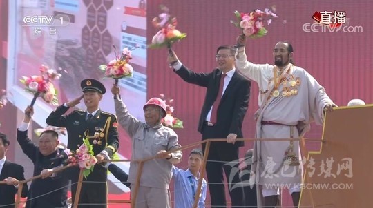 揮舞著手中的花束,臉上洋溢著燦爛的笑容,站在“凝心鑄魂”方陣主題彩車上的其美多吉,一身白色藏族傳統(tǒng)服飾,引人矚目。