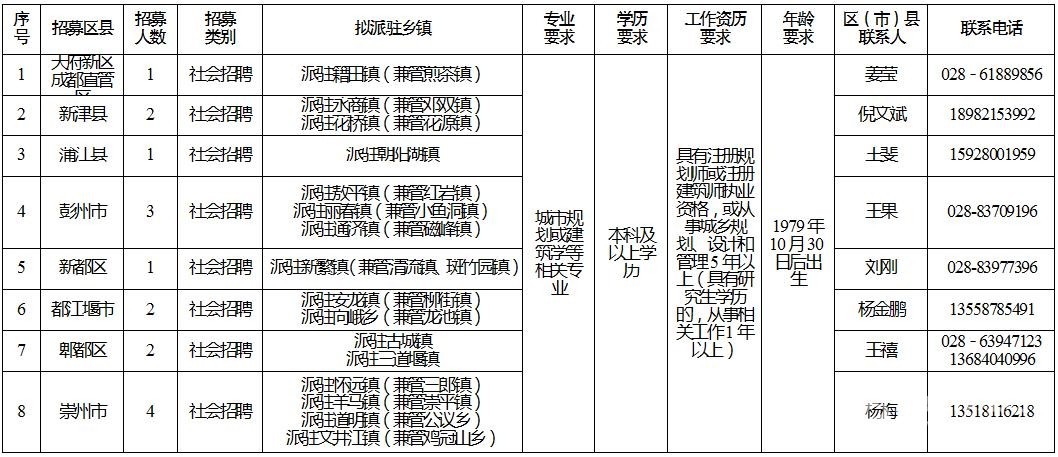 1﹒社會(huì)招聘招募區(qū)(市)縣:成都天府新區(qū)、新都區(qū)、郫都區(qū)、簡(jiǎn)陽(yáng)市、都江堰市、彭州市、邛崍市、崇州市、金堂縣、新津縣、大邑縣、蒲江縣(具體信息詳見(jiàn)附件1)。