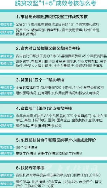如何考?省扶貧開發(fā)局相關(guān)負(fù)責(zé)人介紹,具體而言,就是將黨委和政府脫貧攻堅(jiān)工作成效考核、省直部門(單位)定點(diǎn)扶貧考核、扶貧專項(xiàng)考核、省內(nèi)對(duì)口幫扶藏區(qū)彝區(qū)貧困縣考核、貧困村“五個(gè)一”幫扶考核、東西部扶貧協(xié)作和藏區(qū)攜手奔小康成效評(píng)價(jià)統(tǒng)一整合為脫貧攻堅(jiān)成效考核,一支隊(duì)伍完成所有考核。
