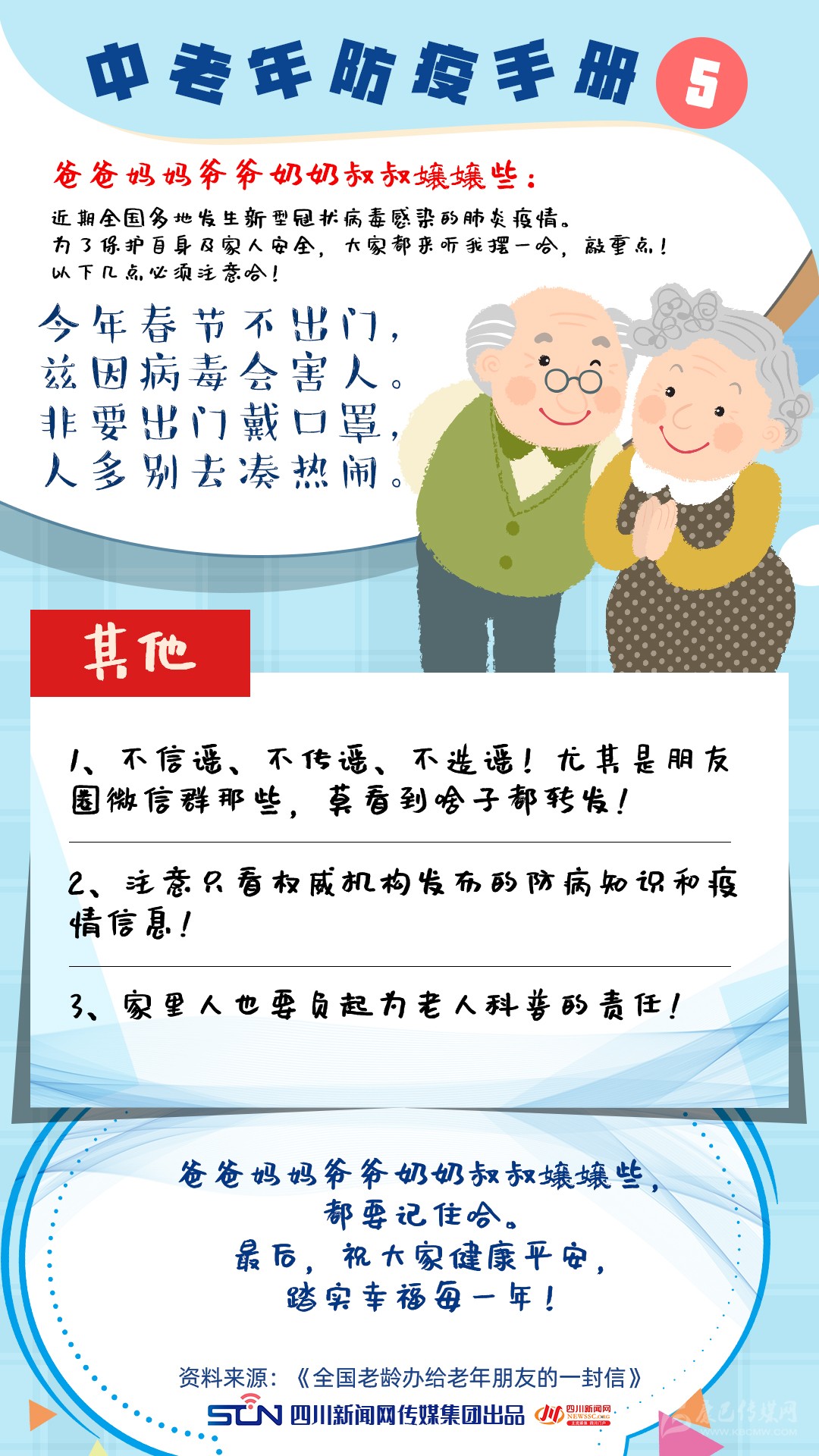 對(duì)此,為了讓“這屆難帶的父母”進(jìn)一步認(rèn)識(shí)新型冠狀病毒感染的肺炎疫情,四川新聞網(wǎng)特別推出《中老年防疫手冊(cè)》,呼吁老年人重視疫情,科學(xué)防控,做好自己健康的第一責(zé)任人。還在等什么,快轉(zhuǎn)給你那“倔強(qiáng)”的父母吧!