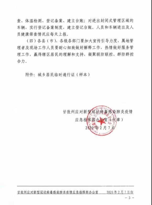為進(jìn)一步做好全州新型冠狀病毒肺炎疫情防控工作,最大程度保障人民群眾生命安全和身體健康,最大限度減少人員流動(dòng)最大力度防止和遏制疫情傳播蔓延,根據(jù)《中華人民共和國突發(fā)事件應(yīng)對(duì)法》《中華人民共和國傳染病防治法》等法律法規(guī)和《甘孜州應(yīng)對(duì)新型冠狀病毒感染肺炎疫情應(yīng)急指揮部公告(第5號(hào))》(以下簡(jiǎn)稱《公告》),自即日起,州域內(nèi)所有人員和車輛出入封閉式管理區(qū)域?qū)嵭信R時(shí)管制,均憑證通行。現(xiàn)將有關(guān)事宜通知如下。