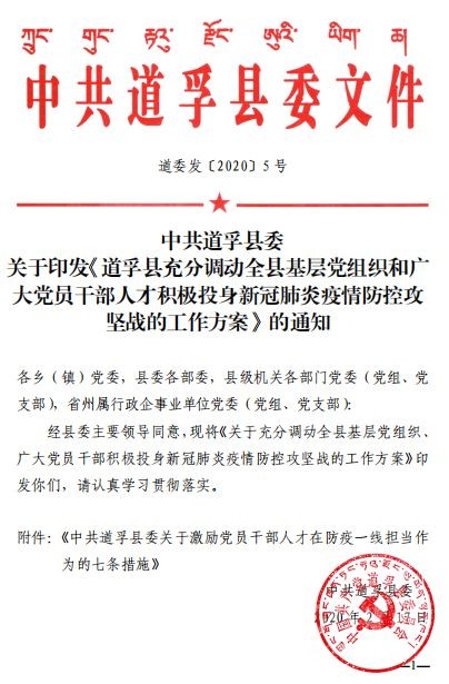 疾風(fēng)知?jiǎng)挪?,板蕩識(shí)誠(chéng)臣。自新型冠狀病毒肺炎疫情防控阻擊戰(zhàn)打響以來(lái),道孚縣各級(jí)黨組織和黨員、干部主動(dòng)擔(dān)當(dāng)作為,積極投入疫情防控最前線,為有力防控疫情蔓延作出重要貢獻(xiàn)。近日,道孚縣委印發(fā)《中共道孚縣委關(guān)于激勵(lì)黨員干部人才在防疫一線擔(dān)當(dāng)作為的七條措施》,關(guān)心關(guān)愛(ài)、激勵(lì)引導(dǎo)廣大黨員、干部、各類人才在疫情防控一線履職盡責(zé)、擔(dān)當(dāng)作為、安心戰(zhàn)斗。