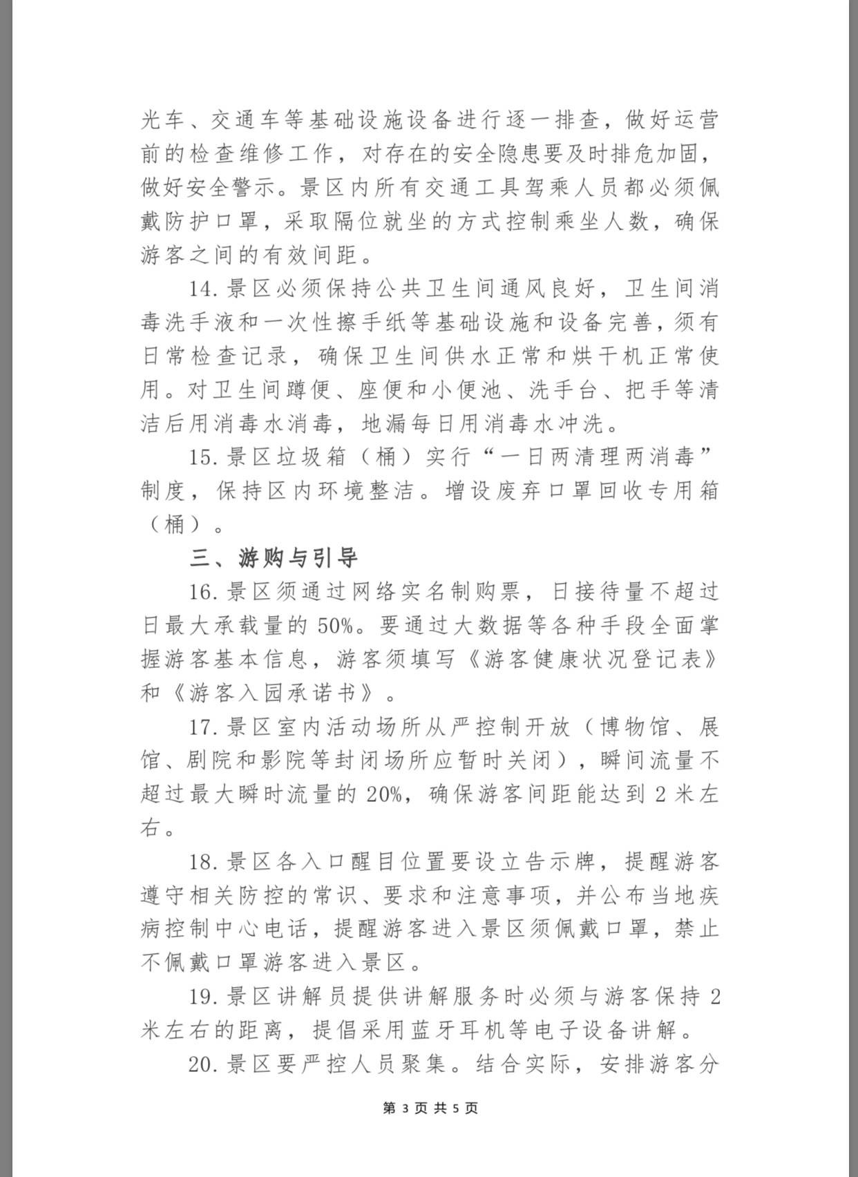 為保障景區(qū)安全有序恢復(fù)開(kāi)放,景區(qū)游客服務(wù)中心和(志愿者或商業(yè))服務(wù)網(wǎng)點(diǎn)除放置免費(fèi)中英文防治新冠肺炎的宣傳資料外,還要放置“本中心已消毒”告示,應(yīng)備有75%的酒精棉球或其它消毒液等免費(fèi)供游客使用。同時(shí),景區(qū)內(nèi)所有交通工具駕乘人員都必須佩戴防護(hù)口罩,采取隔位就坐的方式控制乘坐人數(shù),確保游客之間的有效間距,而垃圾箱(桶)則實(shí)行“一日兩清理兩消毒”制度,增設(shè)廢棄口罩回收專(zhuān)用箱(桶)。