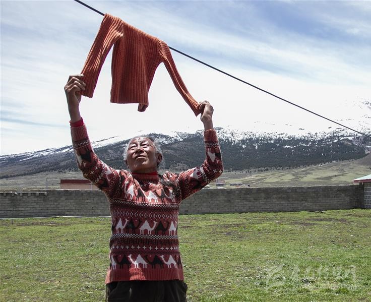 5月30日,四川甘孜藏族自治州理塘縣奔戈鄉(xiāng)卡灰村村民洛登在院里晾曬衣物。新華社記者 李夢馨 攝