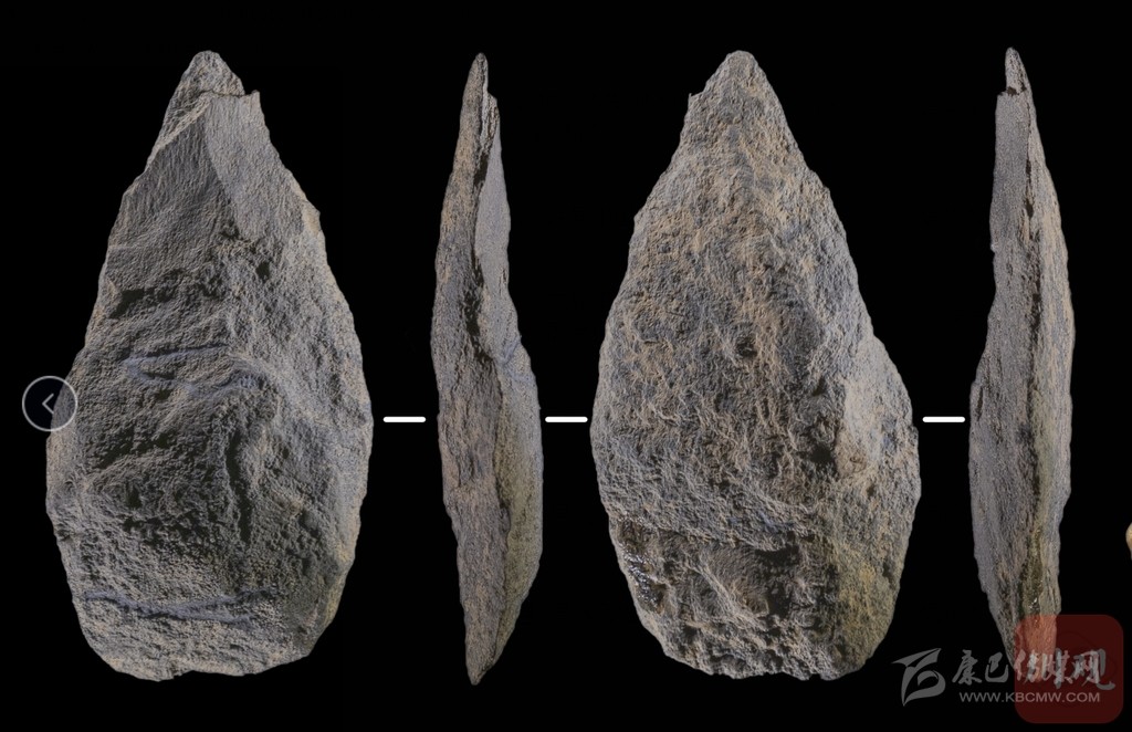 這塊有一端很尖的石頭,據(jù)說叫小型兩面器,看上去和手斧有點(diǎn)像,但比手斧小很多,目前在國內(nèi)舊石器時(shí)代尚屬首次發(fā)現(xiàn)。原來,它就是從石塊上打下的石片經(jīng)過加工后而成。它的邊緣頗為鋒利,端部尖銳,同樣具有切割、鉆孔等多種功能。