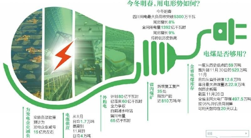 截至11月28日,全省主網(wǎng)火電廠存煤497.5萬噸,按95%開機負(fù)荷測算,可用天數(shù)均在20天以上。同時,國網(wǎng)四川省電力公司全力落實外購電量和留川電量,外購電計劃80億千瓦時已落實60億千瓦時,全力爭取白鶴灘水電站留川電量65億千瓦時。