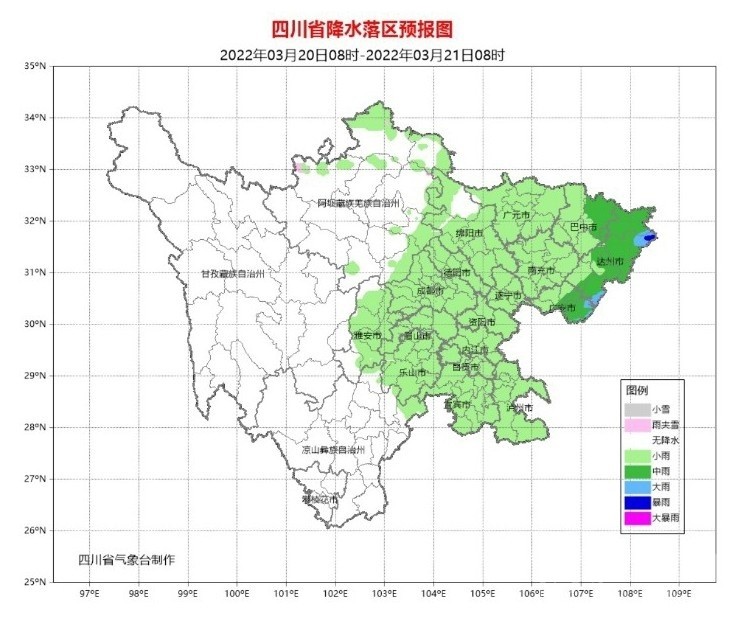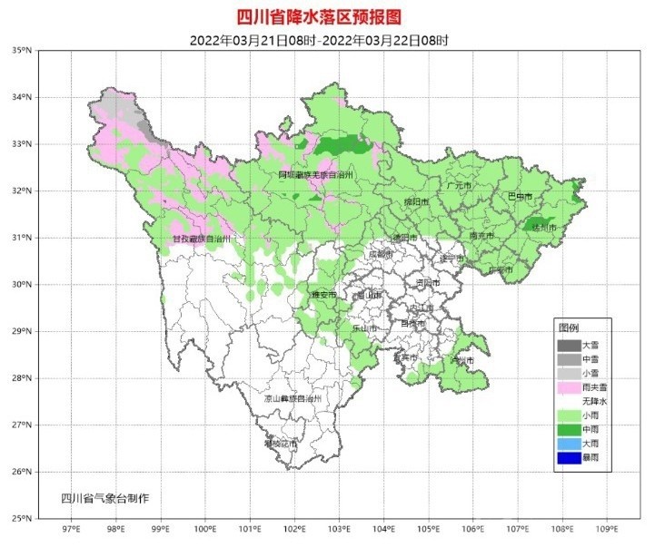 21日白天到晚上,盆地各市陰天間多云,廣元、綿陽(yáng)、德陽(yáng)、巴中、達(dá)州、南充、廣安、瀘州、雅安9市和成都西部、樂(lè)山南部有小雨,其中達(dá)州局部有中雨;阿壩州和甘孜州北部、涼山州東北部多云間陰有陣雨(雪),局地中雨(雪),甘孜州南部和攀西其余地方多云見(jiàn)晴。