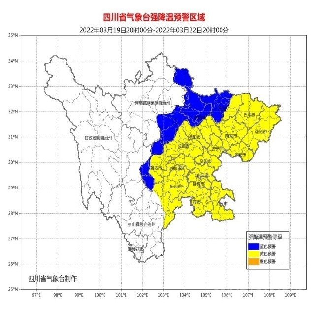 3月18日下午以來(lái),四川省成都、南充、廣元、眉山、內(nèi)江、綿陽(yáng)、雅安、遂寧、樂(lè)山、瀘州、資陽(yáng)、眉山、宜賓13市都發(fā)布了強(qiáng)降溫黃色預(yù)警,德陽(yáng)、巴中2市發(fā)布了強(qiáng)降溫藍(lán)色預(yù)警,廣安、內(nèi)江2市于3月19日升級(jí)發(fā)布了強(qiáng)降溫黃色預(yù)警。