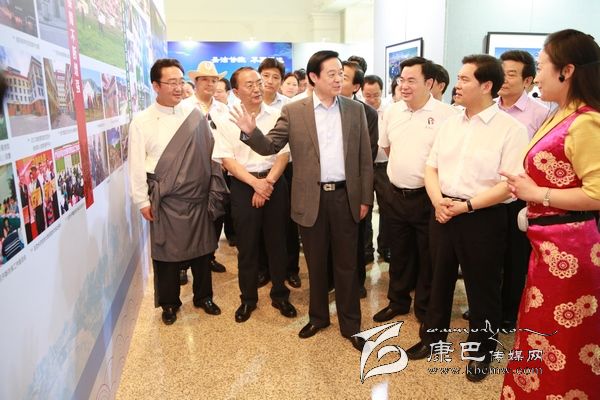 6月8日上午10時,劉奇葆、王正偉來到民族文化宮,首先走進(jìn)四川甘孜藏區(qū)發(fā)展成就暨旅游圖片展現(xiàn)場。這里,展示的是甘孜藏區(qū)經(jīng)濟(jì)社會發(fā)展成就、自然風(fēng)光、歷史文化、民族風(fēng)情、田園藏寨等方面內(nèi)容的圖片。一幅幅圖片,一個個場景,劉奇葆都非常熟悉。在四川工作期間,他曾十幾次奔赴甘孜藏區(qū)考察,足跡遍布全州18個縣。劉奇葆仔細(xì)觀看展示圖片,并不時詢問交通通信、優(yōu)勢產(chǎn)業(yè)等發(fā)展情況以及民生改善的情況。劉奇葆說,甘孜山川秀美,民族風(fēng)情濃郁,是一方充滿生機(jī)和活力的土地,希望甘孜立足自身實際,大力發(fā)展農(nóng)牧業(yè)和文化旅游業(yè),大力加強(qiáng)生態(tài)建設(shè)和環(huán)境保護(hù),大力改善民生,努力走出藏區(qū)科學(xué)發(fā)展、跨越發(fā)展之路。