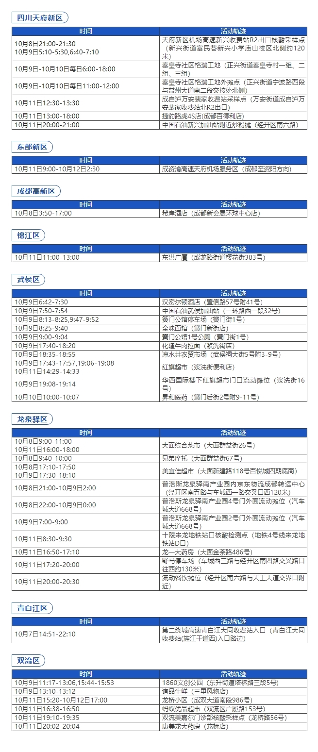 近期新增感染者在蓉軌跡現(xiàn)公布如下,如與以下活動軌跡有重疊,立即向社區(qū)和單位(或居住的酒店)報(bào)備,三天內(nèi)接受三次核酸檢測(間隔24小時(shí)),期間做好個人防護(hù),不聚會、不聚餐。如有疑問,請撥打12345咨詢。