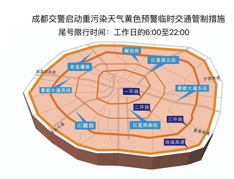 三、工作日的6:00至22:00,在四環(huán)路(成都繞城高速公路G4202,不含)以內(nèi)區(qū)域道路,實行汽車尾號限行,按照機(jī)動車號牌(含臨時號牌汽車)的最后一位阿拉伯?dāng)?shù)字尾號限行。即:星期一限尾號“1”和“6”,星期二限尾號“2”和“7”;星期三限尾號“3”和“8”;星期四限尾號“4”和“9”;星期五限尾號“5”和“0”。公休日因法定節(jié)假日調(diào)休為工作日的,不限行。