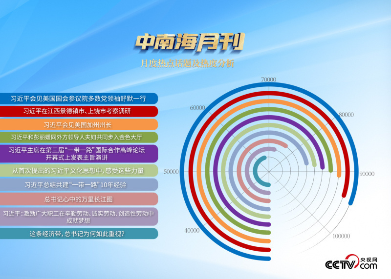 央視網(wǎng)“智聞”系統(tǒng)提取分析10月全網(wǎng)時政新聞熱點顯示,“習近平主席會見美國國會參議院多數(shù)黨領袖舒默一行”“習近平會見美國加州州長”“習近平主持召開進一步推動長江經(jīng)濟帶高質(zhì)量發(fā)展座談會”等話題最受網(wǎng)民關注。