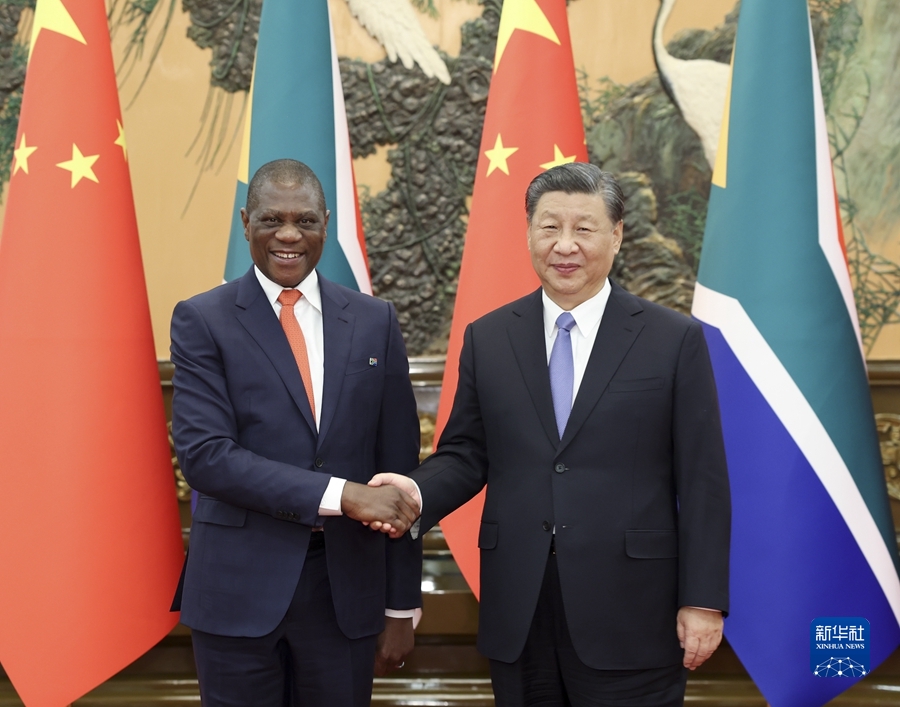 習近平強調,中方支持南非探索符合本國國情的現(xiàn)代化道路,愿同南非進一步夯實政治互信基礎,提升互利合作水平。中方愿同南非等非洲國家一道,落實中國支持非洲工業(yè)化、農業(yè)現(xiàn)代化、人才培養(yǎng)三項舉措以及高質量共建“一帶一路”的八項行動,打造一批高標準、惠民生、可持續(xù)的合作項目,提升中非合作的戰(zhàn)略性和可持續(xù)性,推動構建高水平中非命運共同體。雙方應繼續(xù)密切在金磚國家機制內合作,加強發(fā)展中國家團結合作,推動全球治理體系朝著有利于發(fā)展中國家的方向發(fā)展。