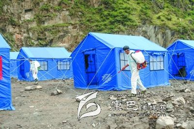 衛(wèi)生防疫人員對(duì)安置點(diǎn)進(jìn)行消毒。