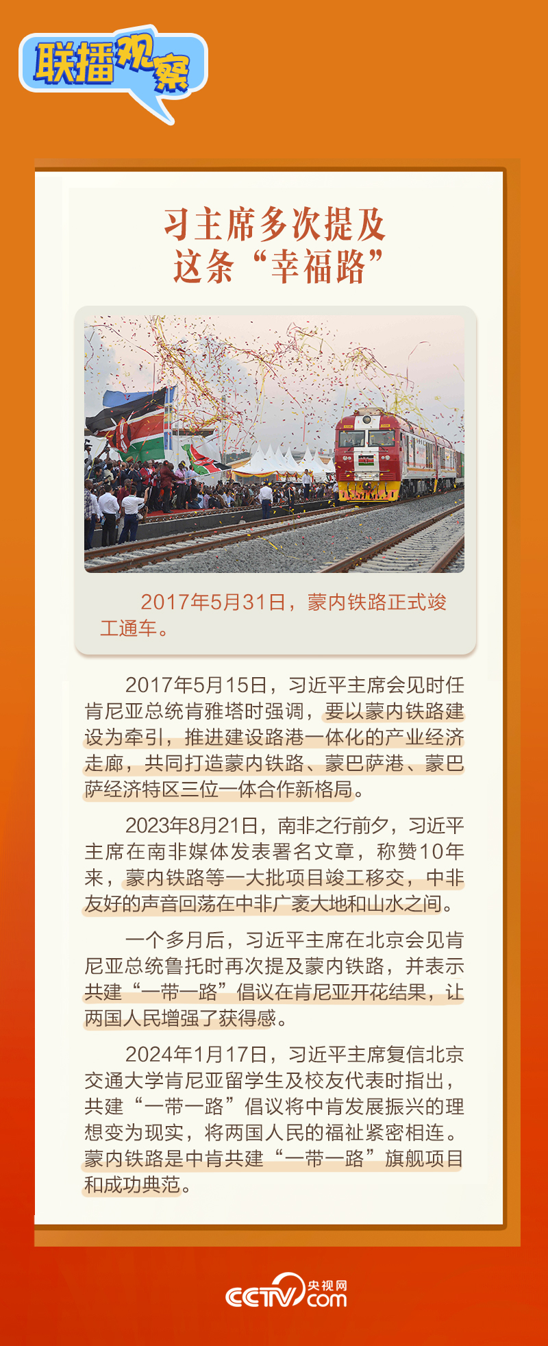 此前,習(xí)主席在外事活動(dòng)中多次提及蒙內(nèi)鐵路,《新聞聯(lián)播》也持續(xù)關(guān)注這條路的建設(shè)及開(kāi)通后的運(yùn)營(yíng)情況。這條“幸福路”有何特別之處,習(xí)主席為何頻頻提及?它的建成通車(chē)給當(dāng)?shù)貛?lái)哪些變化?《聯(lián)播觀(guān)察》邀您一同了解。