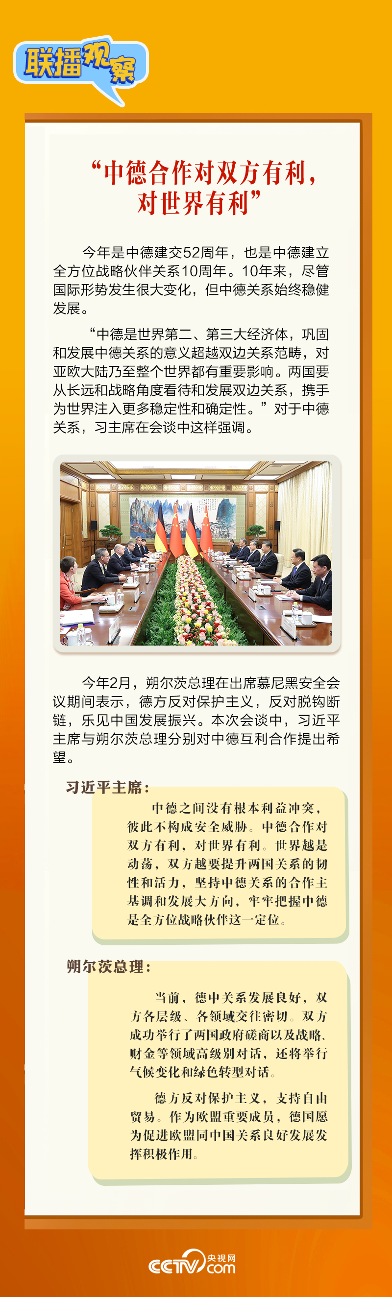 4月16日上午,習(xí)近平主席在北京釣魚(yú)臺(tái)國(guó)賓館會(huì)見(jiàn)朔爾茨總理。會(huì)見(jiàn)中,習(xí)主席強(qiáng)調(diào),要“牢牢把握中德是全方位戰(zhàn)略伙伴這一定位”。中德建立全方位戰(zhàn)略伙伴關(guān)系10年來(lái),兩國(guó)如何共同發(fā)展,相互成就?央視網(wǎng)《聯(lián)播觀察》帶您了解。