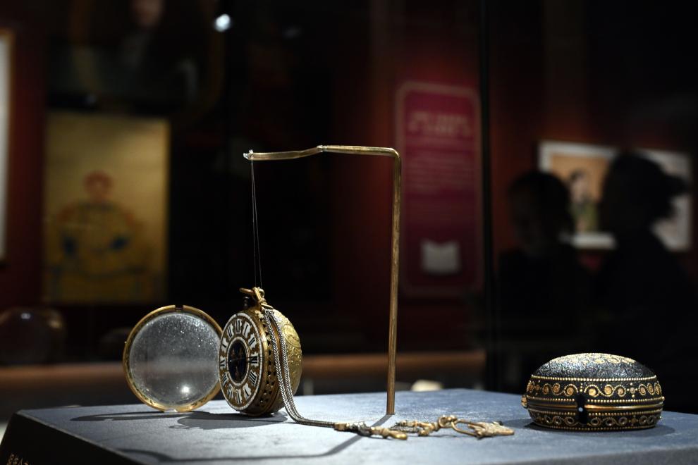 ??這是展出的故宮博物院藏銅鍍金殼開光人物像懷表。2024年4月1日,作為中法文化旅游年的重要項目,“紫禁城與凡爾賽宮——17、18世紀的中法交往”展覽開幕式在北京故宮文華殿舉行,展出大約200件文物精品。(新華社記者金良快攝)